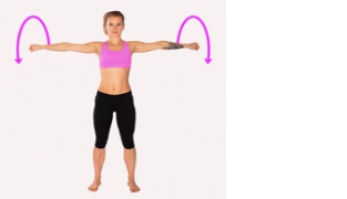 1) Ayaklarınızı omuz genişliğinde açın. Yollarınızı yere paralel olacak şekilde yanlara doğru kaldırın ve ellerinizi yumruk yapın. Hızlı ve kontrollü bir şekilde önce saat yönünde sonra tersine döndürün. 20 dairesel hareket yaptıktan sonra 15 sn dinlenin. Bu egzersizi günde 10-15 kez ( 1 set 20 tekrar olacak şekilde ) yapabilirsiniz.