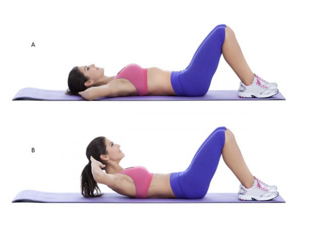 2) Yere sırt üstü uzanın ve ellerinizi kulak hizasında tutun. Dizlerinizi 90 derece kırarak karın bölgenize doğru çekin. Sağ dizinizi göğsünüze çektiğinizde sol dirseğinizi de bu dizinize gelecek şekilde uzatın. Bir dizinizi karnınıza çekerken diğer dizinizi ileri doğru uzatın. Her iki bacağınız için de aynı egzersizi uygulayın. 20 kez tekrarladıktan sonra 15 sn mola verin. Günde 10-15 kez tekrarlayın.